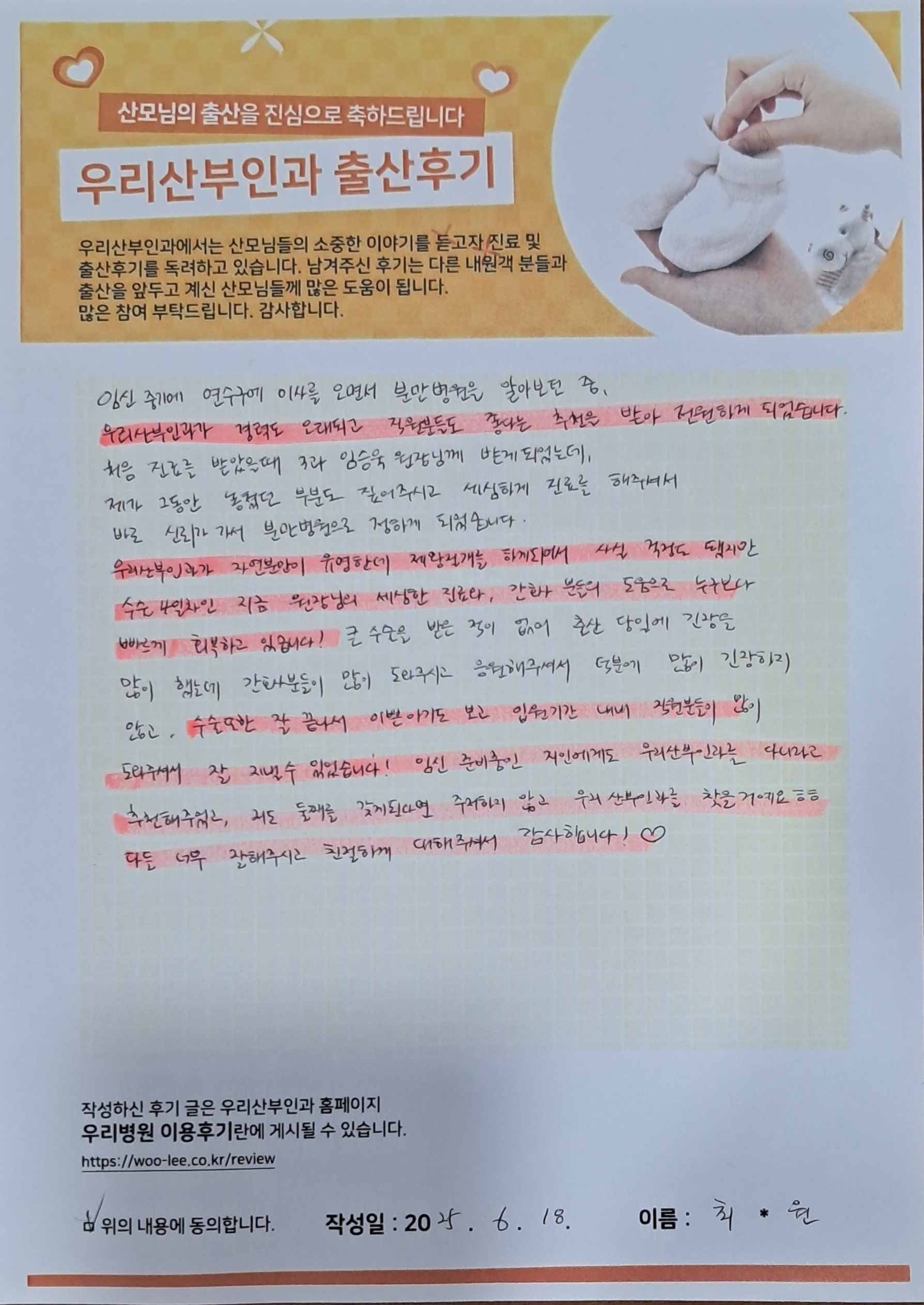 우리산부인과가 자연분만이 유명한데 제왕절개를 하게되면서 사실 걱정도 됐지만 수술 4일차인 지금 원장님의 세심한 진료와 간호사분들의 도움으로 누구보다 빠르게 회복하고 있습니다.