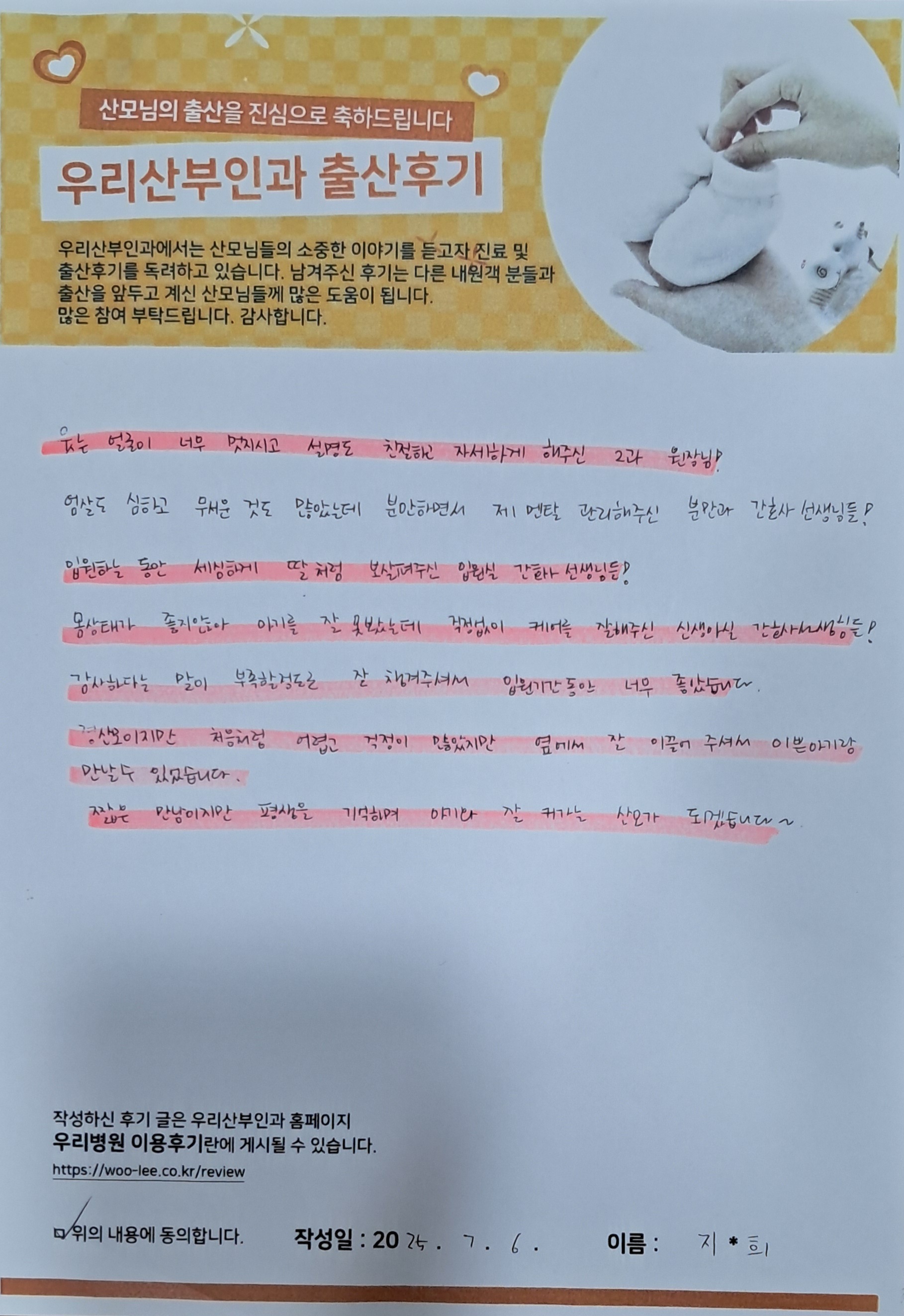 지*희 산모님 출산후기 - 감사하다는 말이 부족할정도로 잘 챙겨주셔서 입원기간 동안 너무 좋았습니다