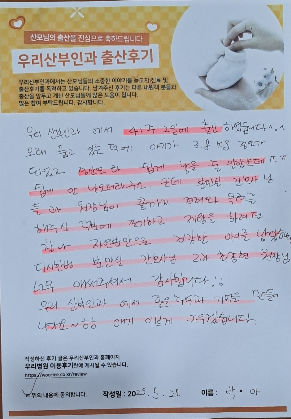 박*아 산모님 출산후기 - 우리산부인과에서 41주 2일에 출산하였습니다^^