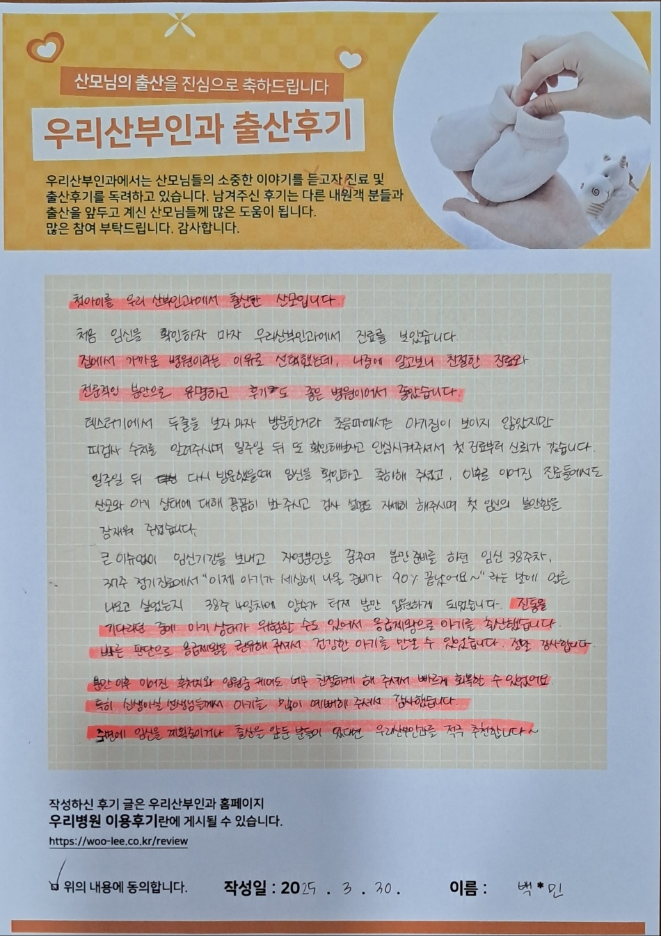 첫아이를 우리산부인과에서 출산한 산모입니다.