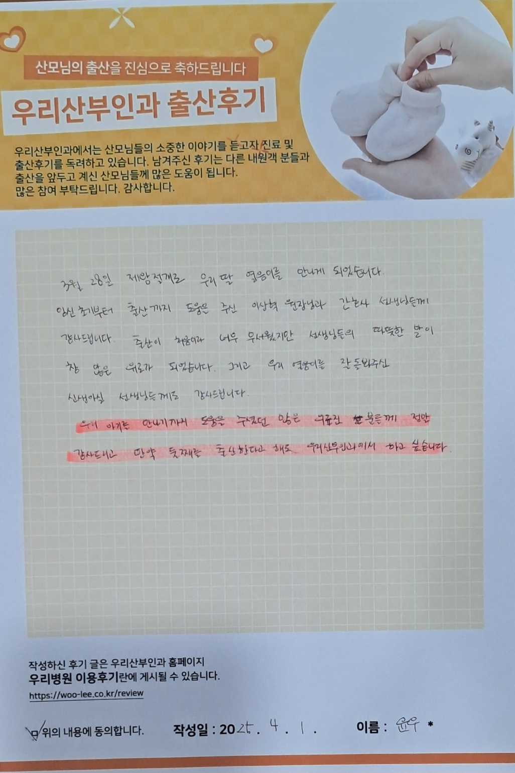 윤우* 산모님 출산후기 - 만약 둘째를 출산한다고 해도 우리산부인과에서 하고 싶습니다.