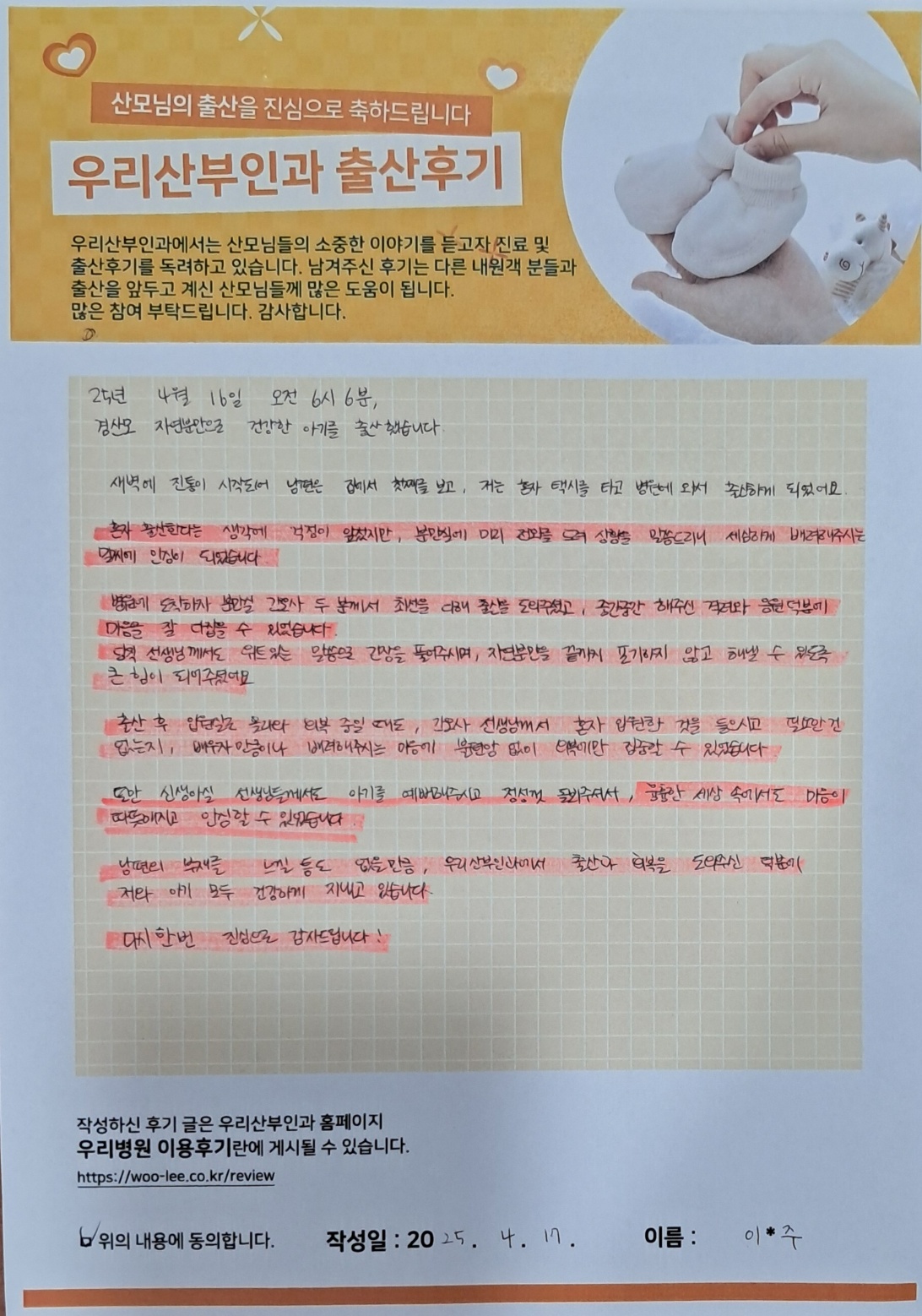 이*주 산모님 출산후기 - 남편의 부재를 느낄틈도 없을만큼, 우리산부인과에서 출산과 회복을 도와주셨어요.
