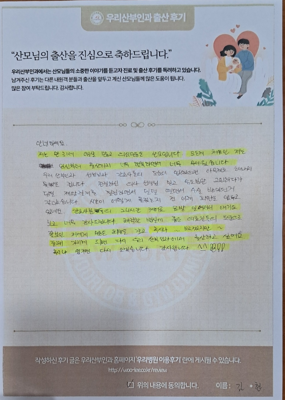 김*현 산모님 출산후기 - 둘째 가지게 되면 다시 우리산부인과에서 출산하고 싶어요.