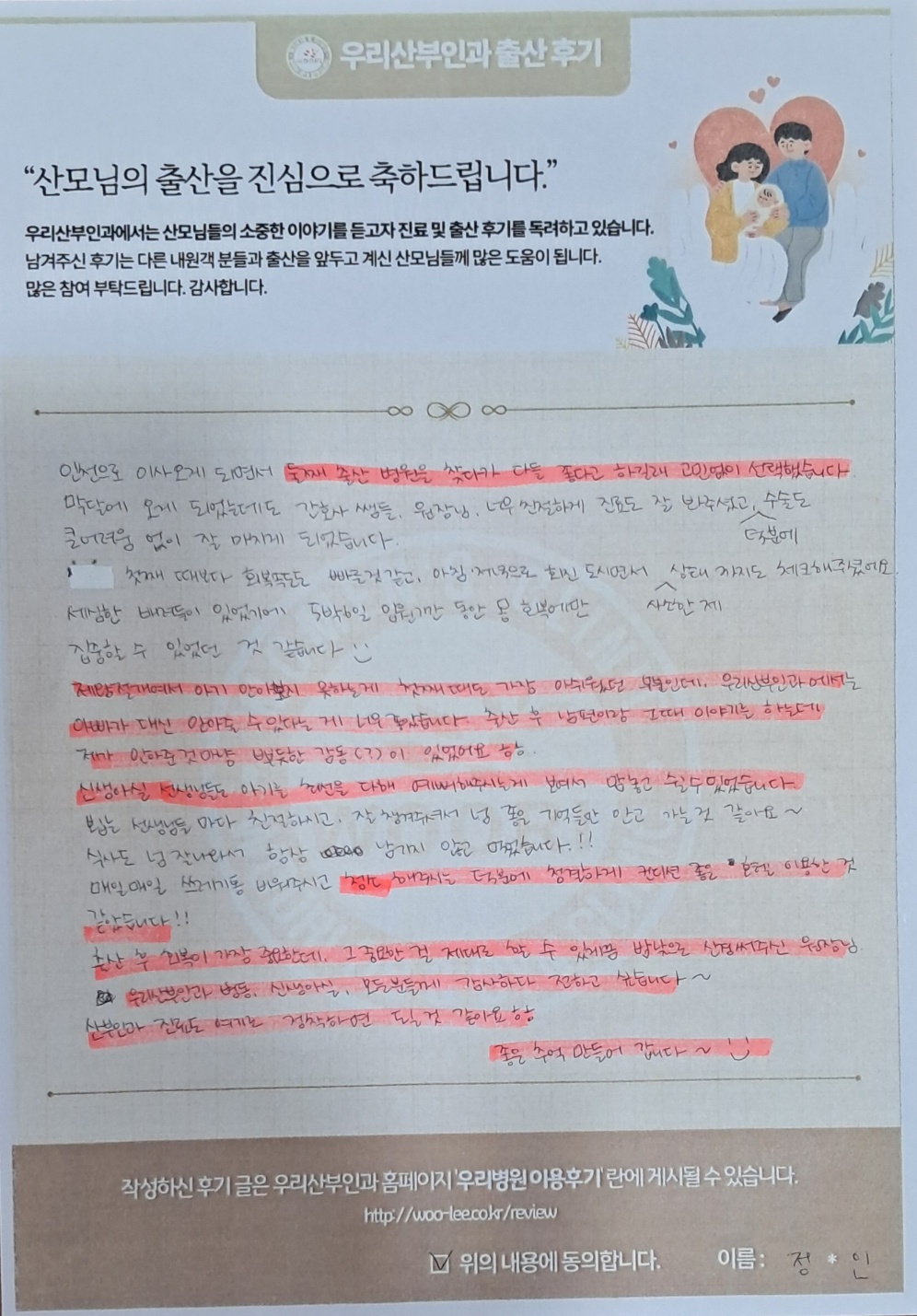 출산 후 회복이 가장 중요한데 그 중요한걸 제대로 할 수 있게끔 밤낮으로 신경써주신 원장님! 우리산부인과 병동, 신생아실, 모든분들께 감사하다 전하고 싶습니다~