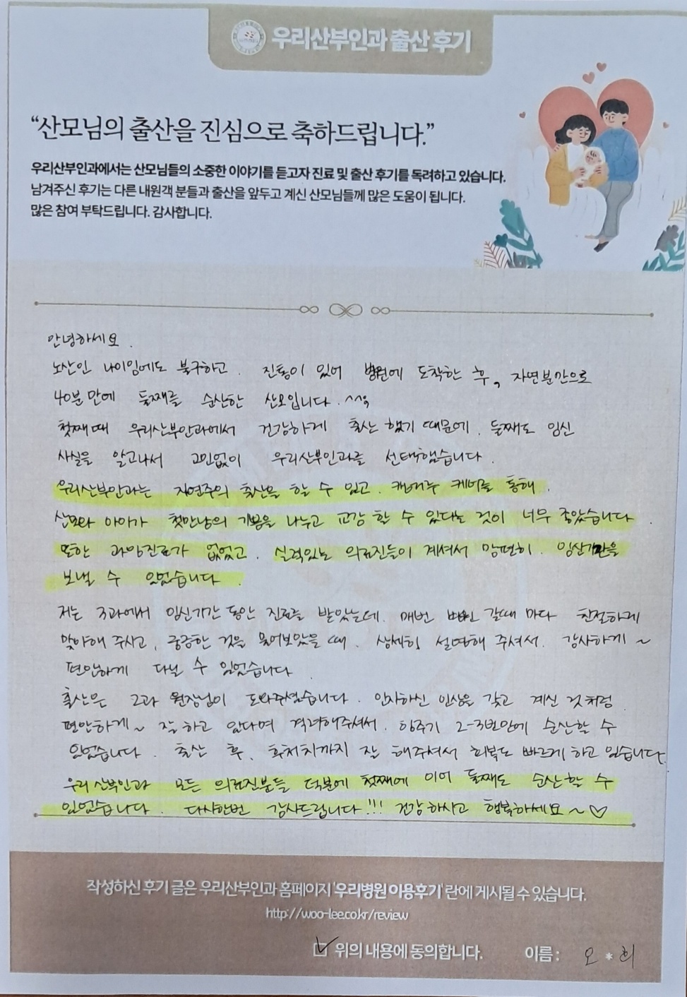 우리산부인과 모든 의료진분들 덕분에 첫째에 이어 둘째도 순산할 수 있었습니다.