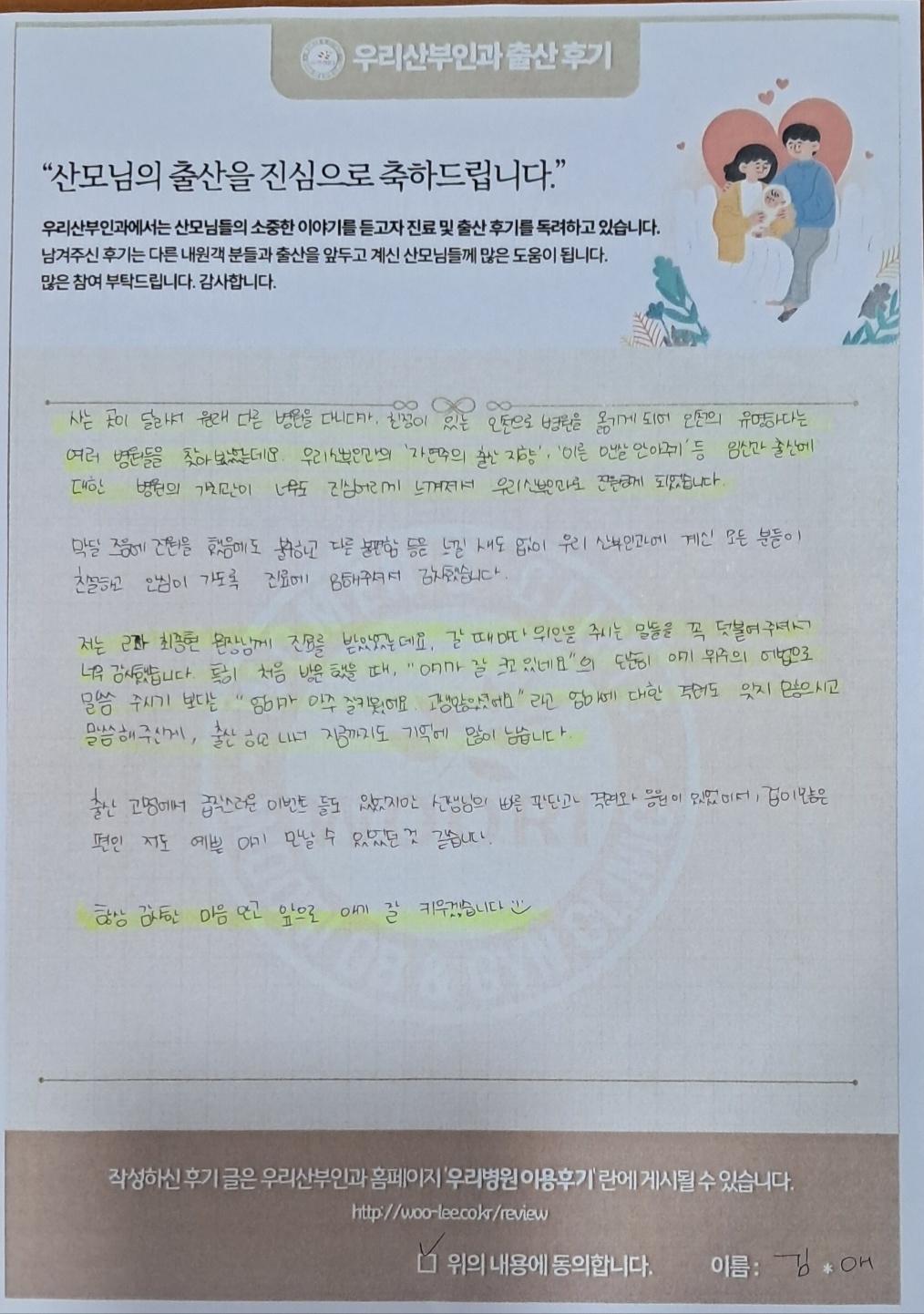 막달 즈음에 전원을 했음에도 불구하고 다른 불편함 등을 느낄 새도 없이 우리산부인과에 계신 모든 분들이 친절하고 안심이 가도록 진료에 임해주셔서 감사했습니다.