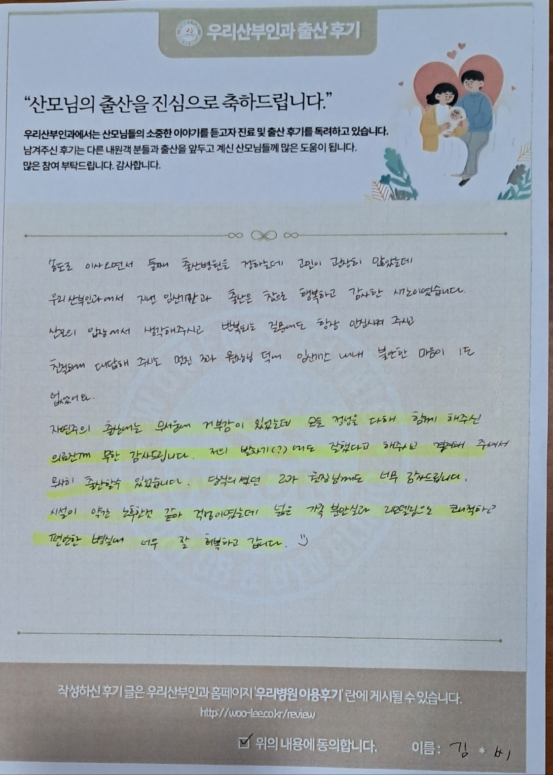 송도로 이사오면서 둘째 출산병원을 정하는데 고민이 굉장히 많았는데 우리산부인과에서 지낸 임신기간과 출산은 참으로 행복하고 감사한 시간이었습니다. 산모의 입장에서 생각해주시고 반복되는 질문에도 항상 안심시켜 주시고 친절하게 대답해 주시는 멋진 3과 원장님 덕에 임신기간 내내 불안한 마음이 1도 없었어요.