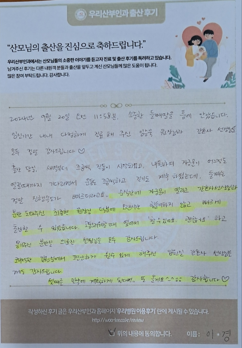 고통스러워할 때 옆에서 '할 수 있어요. 괜찮아요' 하고 용기주신 분만실 의료진 선생님들 모두 감사드립니다.