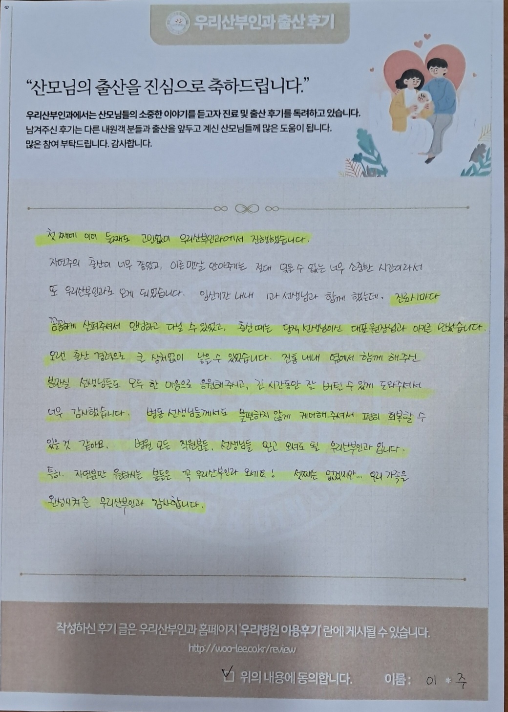 자연주의 출산이 너무 좋았고, 이른맨살안아주기는 절대 잊을 수 없는 너무 소중한 시간이라서 또 우리산부인과로 오게 되었습니다.