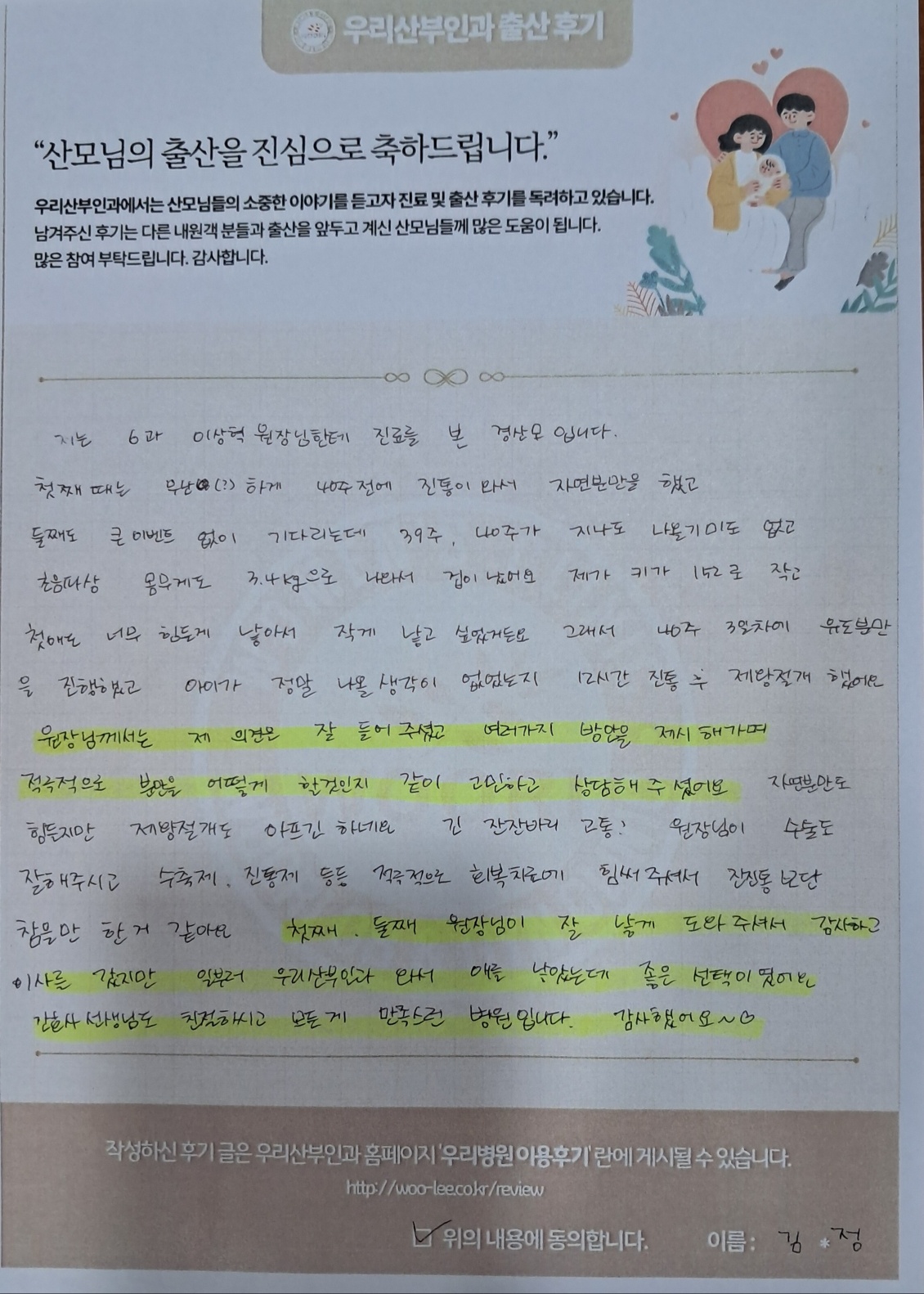 첫째, 둘째 원장님이 잘 낳게 도와주셔서 감사하고 이사를 갔지만 일부러 우리산부인과 와서 애를 낳았는데 좋은 선택이었어요.