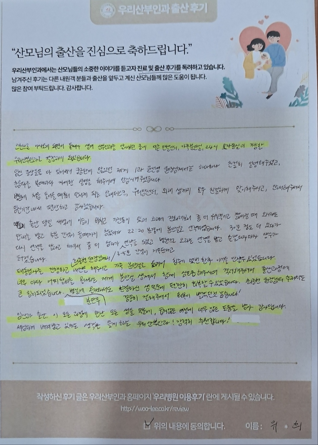 인천으로 이사오게 되면서 둘째가 생겨 산부인과를 알아보던 중에 이른맨살안기, 가족분만실, 24시 모자동실이 가능한 우리산부인과로 결정하게 되었습니다.