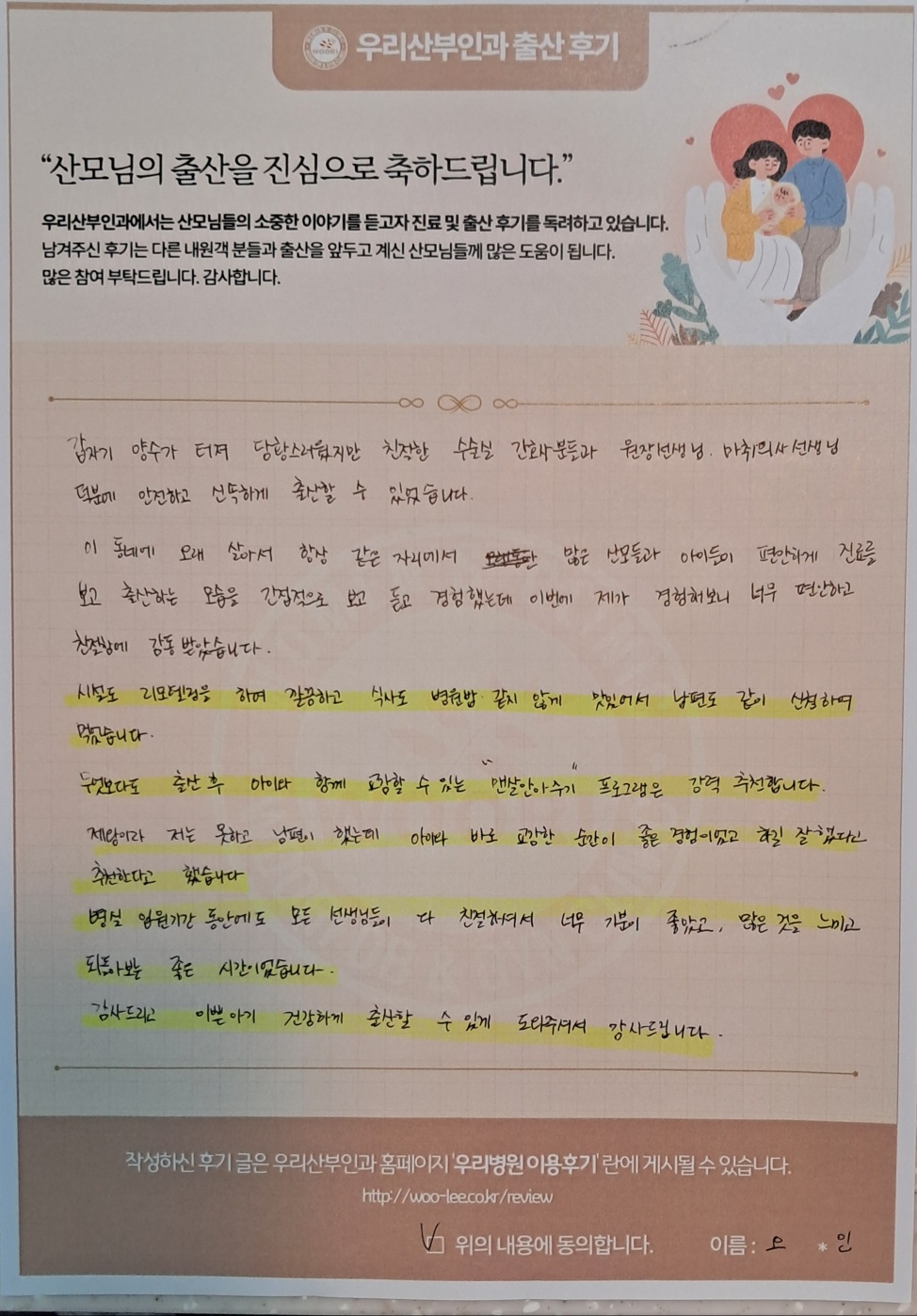 이 동네에 오래 살아서 항상 같은 자리에서 많은 산모들과 아이들이 편안하게 진료를 보고 출산하는 모습을 간접저으로 보고 듣고 경험했는데 이번에 제가 경험해보니 너무 편안하고 친절함에 감동받았습니다.