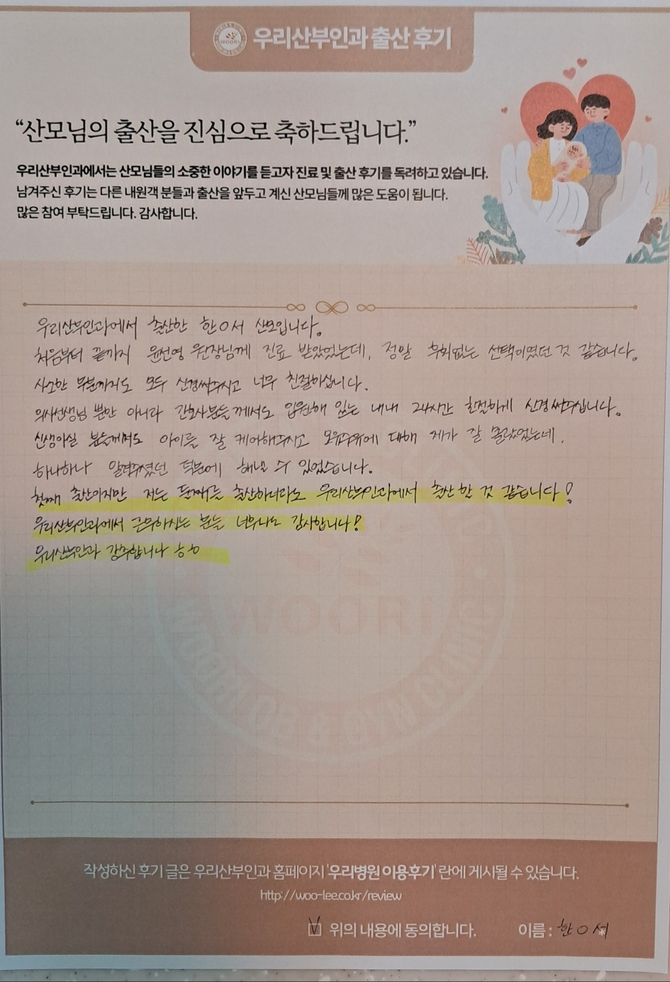 첫째 출산이지만 저는 둘째를 출산하더라도 우리산부인과에서 출산할 것 같습니다.