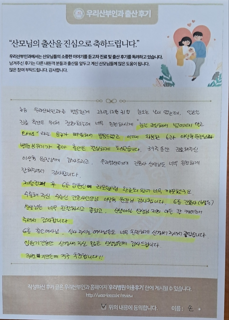 39주 동안 진료해주신 이상혁 원장님께 감사드리고, 우리맘센터에 간호사 선생님도 너무 친절하게 잘 해주셔서 감사합니다.