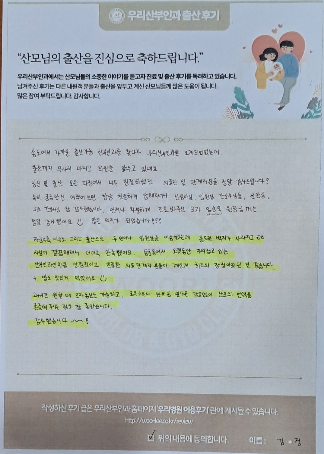 김*정 출산후기 - 산모의 선택을 존중해주시는 우리산부인과 참 좋았습니다.
