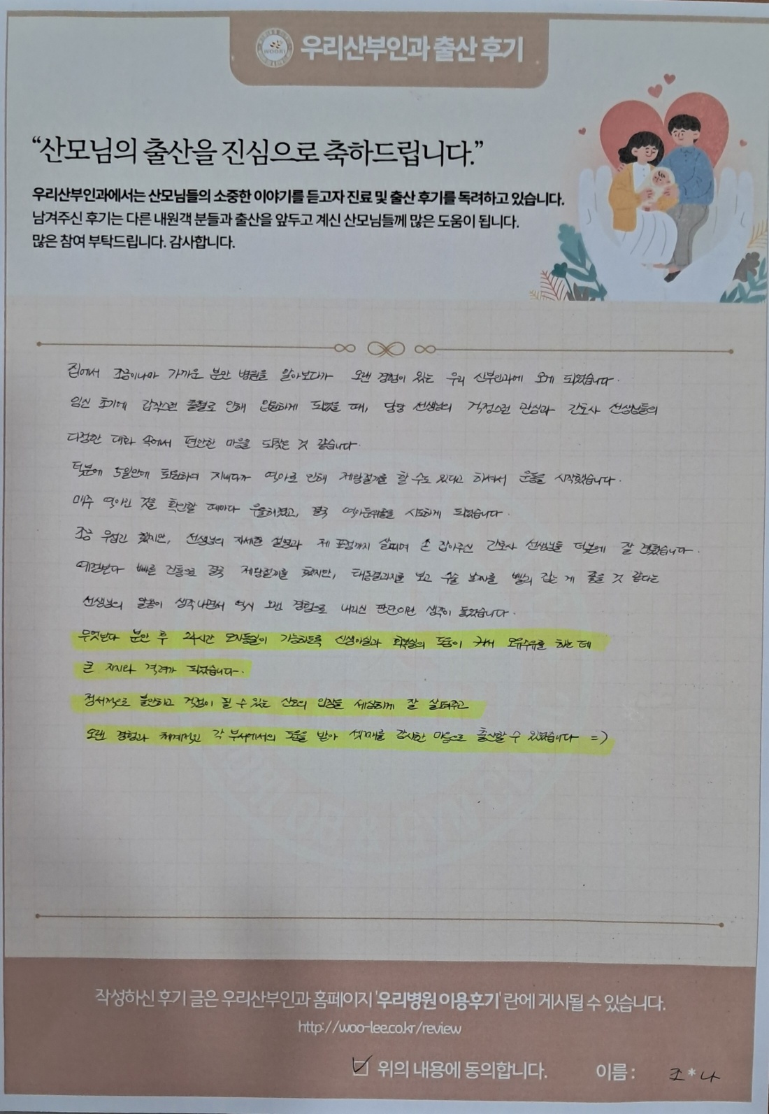 집에서 조금이나마 가까운 분만 병원을 알아보다가 오랜 경험이 있는 우리산부인과에 오게되었습니다. 임신 초기에 갑작스런 출혈로 인해 입원하게 되었을 때, 담당 선생님의 걱정스런 관심과 간호사 선생님들의 다정한 대화 속에서 편안한 마음을 되찾은 것 같습니다.