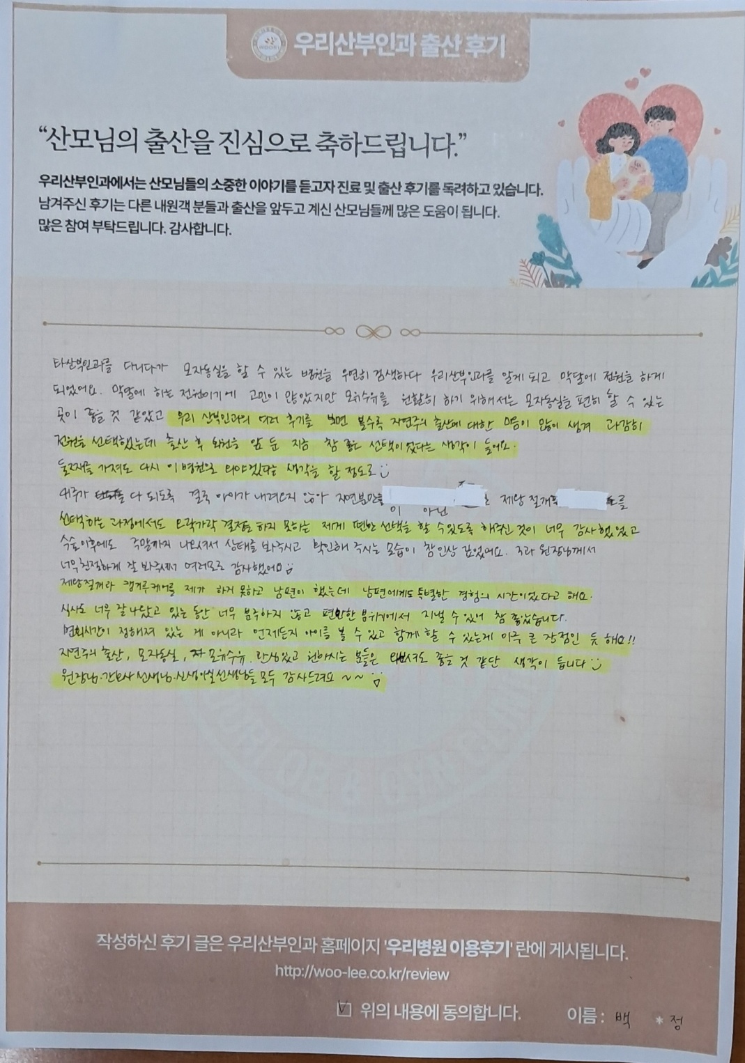 막달에 하는 전원이기에 고민이 많았지만 모유수유를 원활히 하기 위해서는 모자동실을 편히 할 수 있는 곳이 좋을 것 같았고 우리산부인과의 여러 후기를 보면 볼수록 자연주의출산에 대한 믿음이 많이 생겨 과감히 전원을 선택했는데 출산 후 퇴원을 앞 둔 지금 참 좋은 선택이었다는 생각이 들어요.