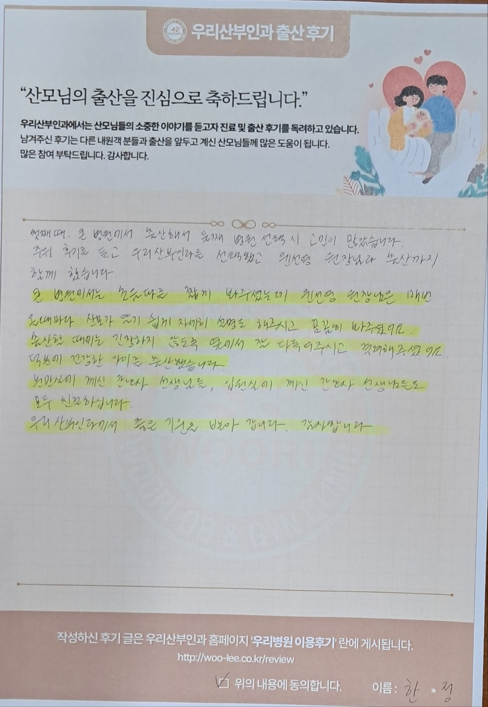 주위 후기를 듣고 우리산부인과를 선택했고 윤선영 원장님과 출산까지 함께헸습니다.