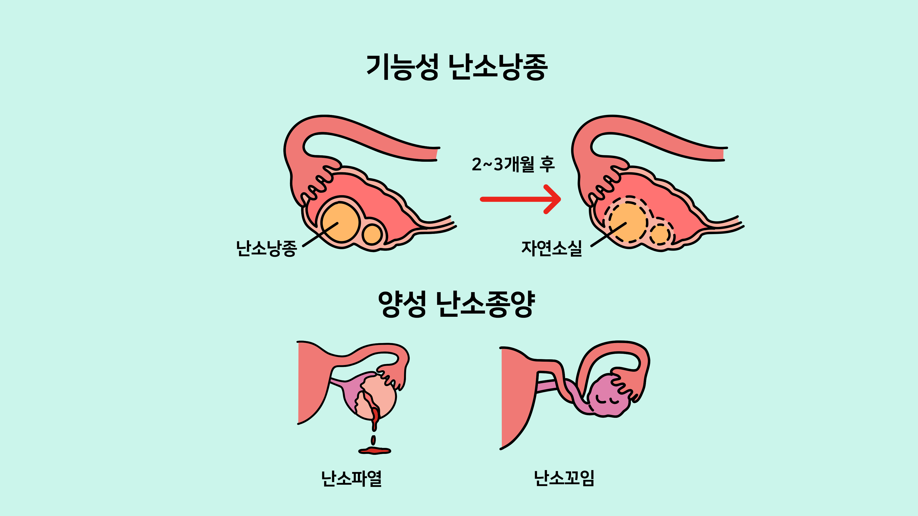기능성난소낭종은 무엇일까요? 난소는 난포를 배출하고 여성 호르몬을 만드는 역할을 합니다. 이때 난소에서 생리 주기에 맞춰 한 달에 한번 난포가 성숙되어 난자를 배출하는 '배란' 과정이 발생하는데 배란 과정에서 난포가 배란되지 못하고 액체가 계속 차거나 배란 된 후 난포가 있던 부위에 액체 또는 피가 차서 생기는 경우 난소낭종이 됩니다. 이러한 낭종은 2~3개월 후에 대부분 낭종이 소실됩니다. 양성 난소종양의 경우 대부분 무증상이나 난소염전 (난소가 꼬이는 것), 난소 파열 시에는 심각한 통증이 야기되고 응급 수술이 필요할 수 있어 조기에 발견하는 것이 중요합니다.