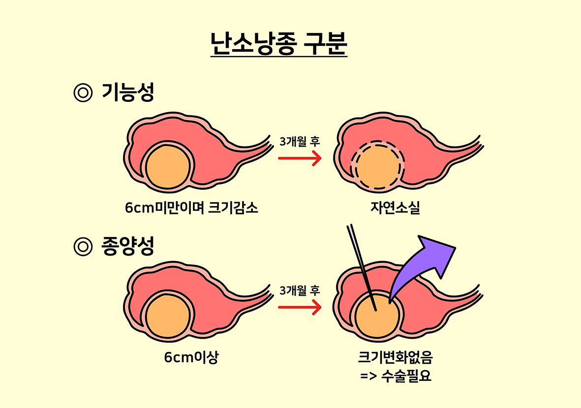 액체로만 차 있는 난소낭종은 기능성과 종양성으로 구분됩니다. 기능성낭종은 자연 소실되나 종양성 난종은 수술이 필요합니다. 그러므로 불필요한 수술을 피하기 위해서는 낭종을 구분하여야 합니다. 그러나 초음파상으로 두 낭종을 구분하기가 힘듭니다. 종양성 낭종은 처음 초음파 시 크기가 6cm이상이거나, 6cm 미만인 경우 3개월을 기다려 크기가 줄지 않은 경우입니다.