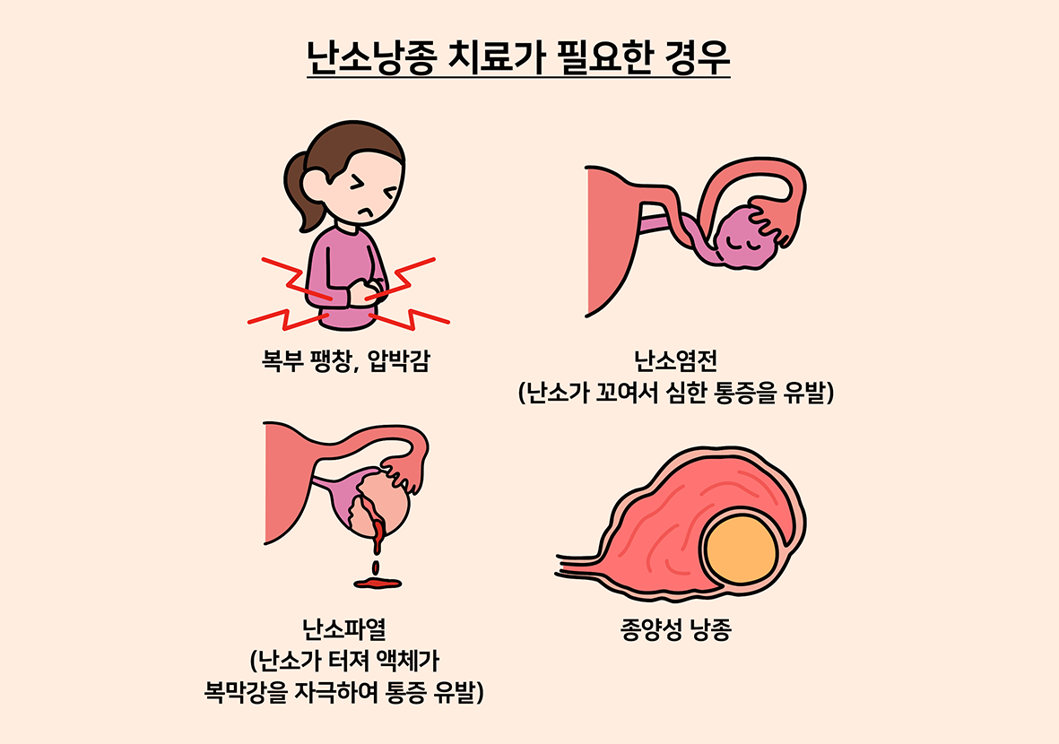 다음 항목에 해당되는 경우 난소낭종의 치료가 필요합니다.