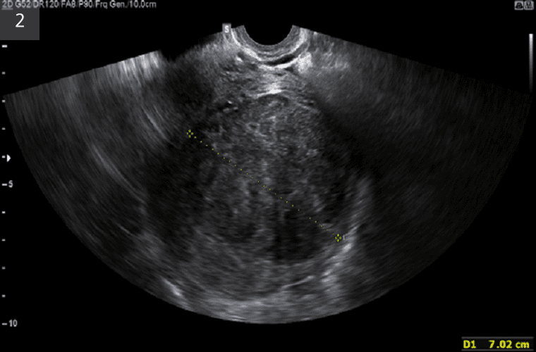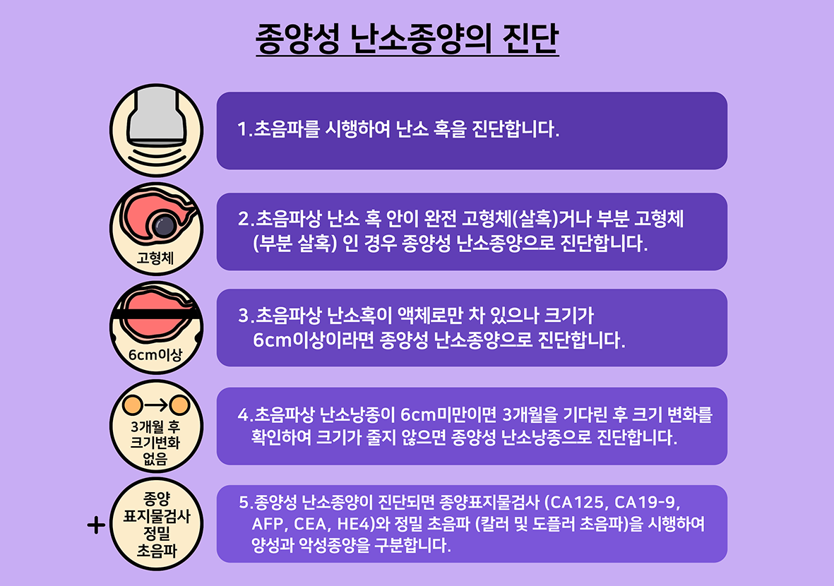 초음파를 시행하여 난소 혹을 진단합니다. 초음파상 난소 혹 안이 완전 고형체(살혹)거나 부분 고형체(부분 살혹) 인 경우 종양성 난소종양으로 진단합니다. 초음파상 난소혹이 액체로만 차 있으나 크기가 6cm이상이라면 종양성 난소종양으로 진단합니다. 초음파상 난소낭종이 6cm미만이면 3개월을 기다린 후 크기 변화를 확인하여 크기가 줄지 않으면 종양성 난소낭종으로 진단합니다. 종양성 난소종양이 진단되면 종양표지물 검사 (CA125, CA19-9, AFP, CEA, HE4) 와 정밀 초음파 (칼러 및 도플러 초음파)을 시행하여 양성과 악성종양을 구분합니다.