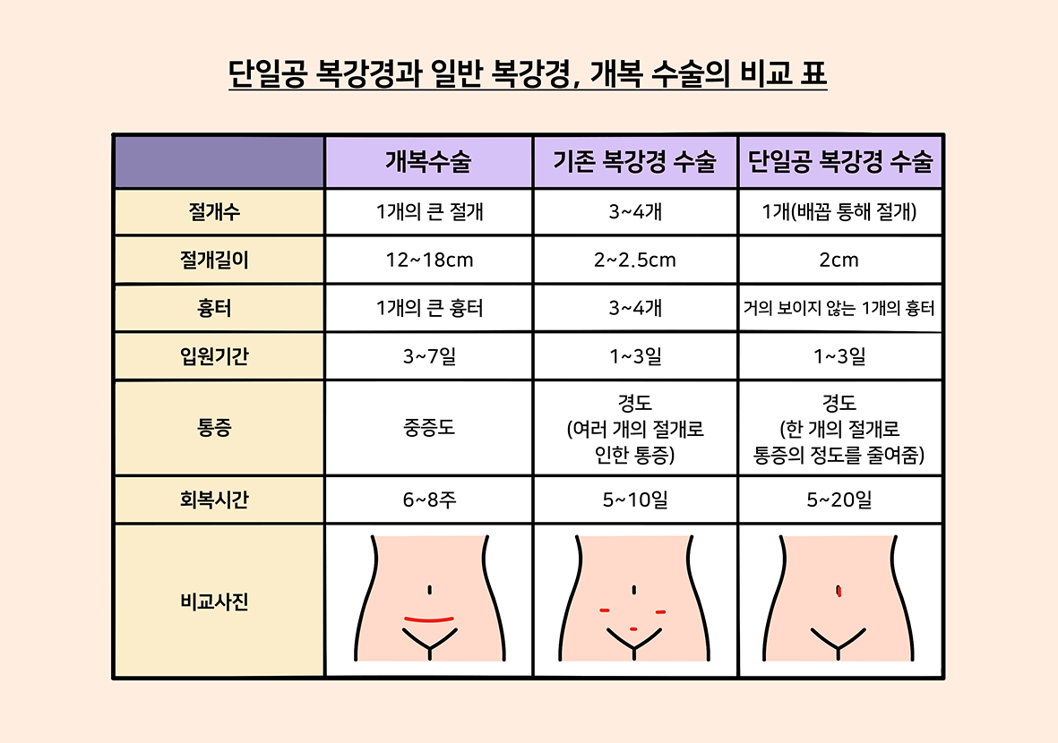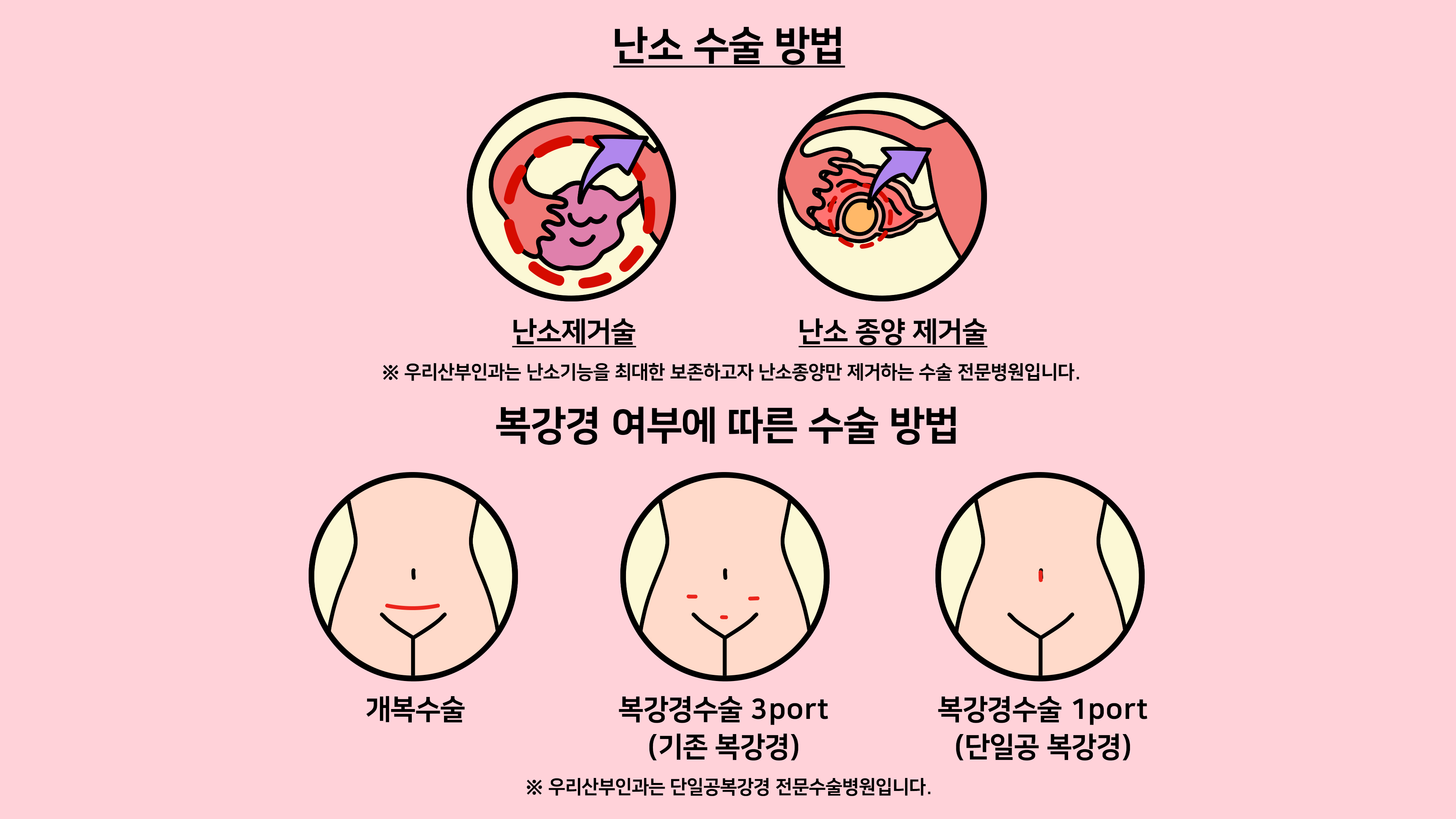 난소 제거술은 악성 난소암, 양성난소종양 중 크기가 너무 큰 경우 또는 초음파상 혹 구조가 복잡한 경우 사용됩니다. 난소종양제거술은 양성난소종양에 사용됩니다. 우리산부인과는 난소기능을 최대한 보존하고자 난소종양만 제거하는 수술 전문병원입니다. 복강경 여부에 따른 수술 방법은 다음과 같습니다. 개복수술, 복강경수술, 단일공 복강경수술이 있습니다. 우리산부인과는 단일공복강경 전문수술병원입니다.