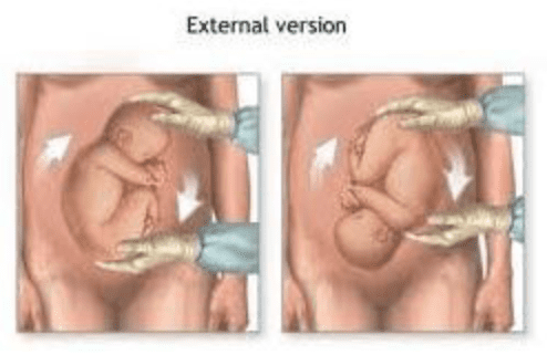 임신말기에 태아가 둔위(엉덩이가 아래로 있는 자세)로 있을 때 의사가 산모의 복부에서 만져지는 태아의 머리와 엉덩이를 손으로 잡고 조심스럽게 돌려서 정상분만을 할 수 있도록 두위(머리가 아래로 있는 자세)로 교정시키는 방법을 말합니다.